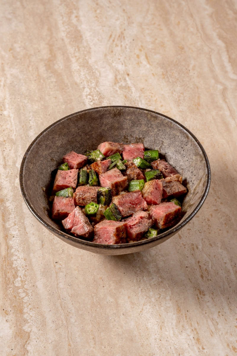Beef saikoro chahan is a refined take on fried rice. Chef Run uses a special wok technique to create a slightly crispy rice which is finished with Hokkaido butter and Japanese F1 steak. Grilled Japanese okra is added as the final component to cut through the richness of the dish,, and who doesn't love grilled okra?!