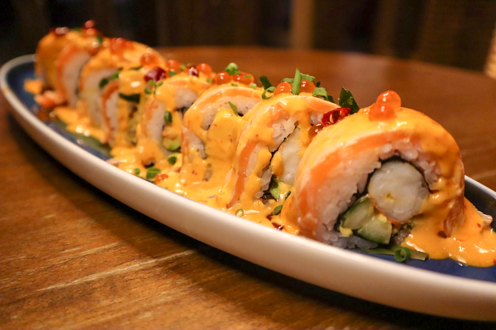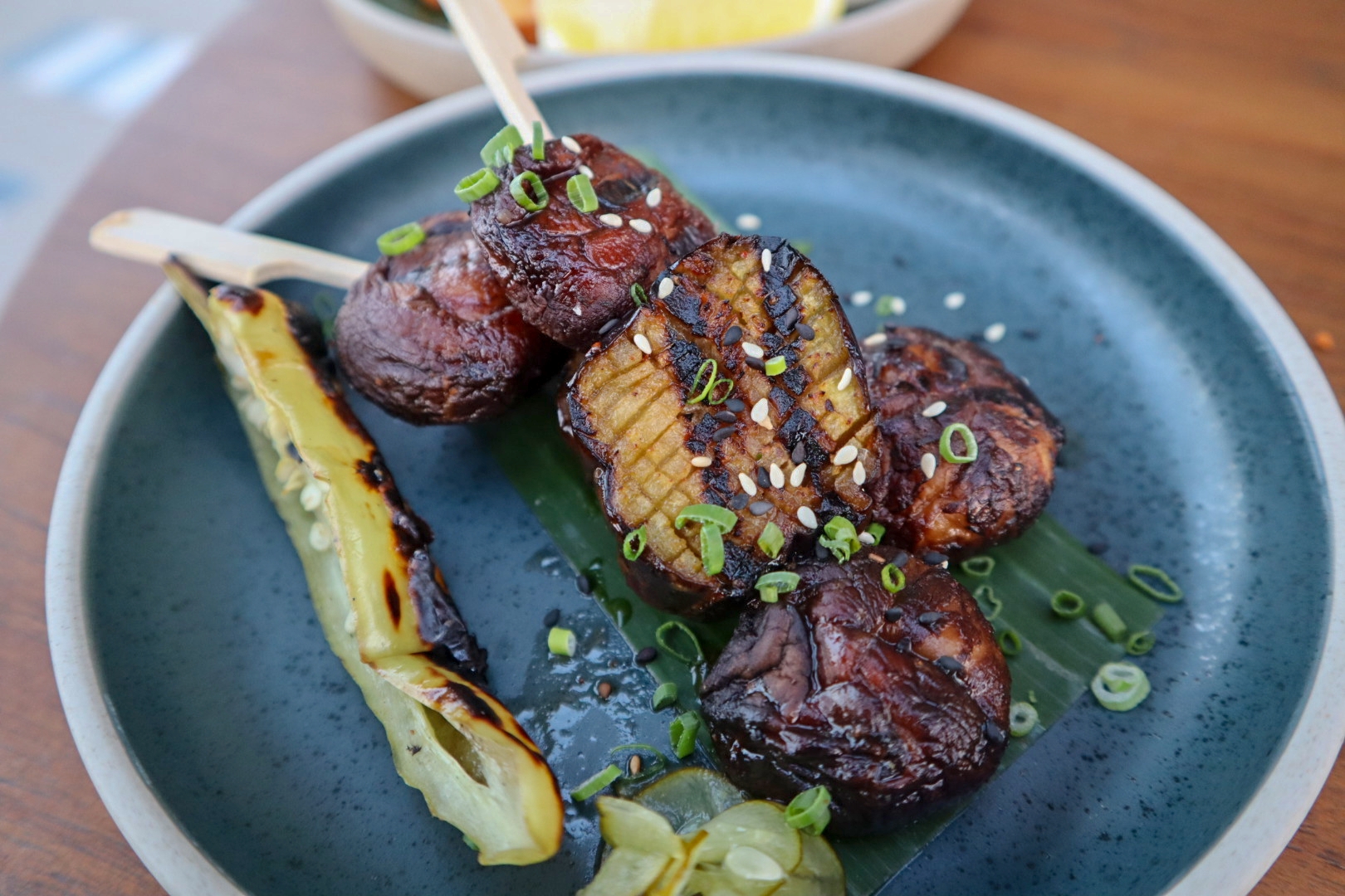 For raw delights, you may want to try Spicy tuna larb tartare or Tom yum tiger roll. Savour skewers include Salmon belly seasoned with spicy sauce and meaty Eggplant and shitake enhanced with teriyaki sauce.