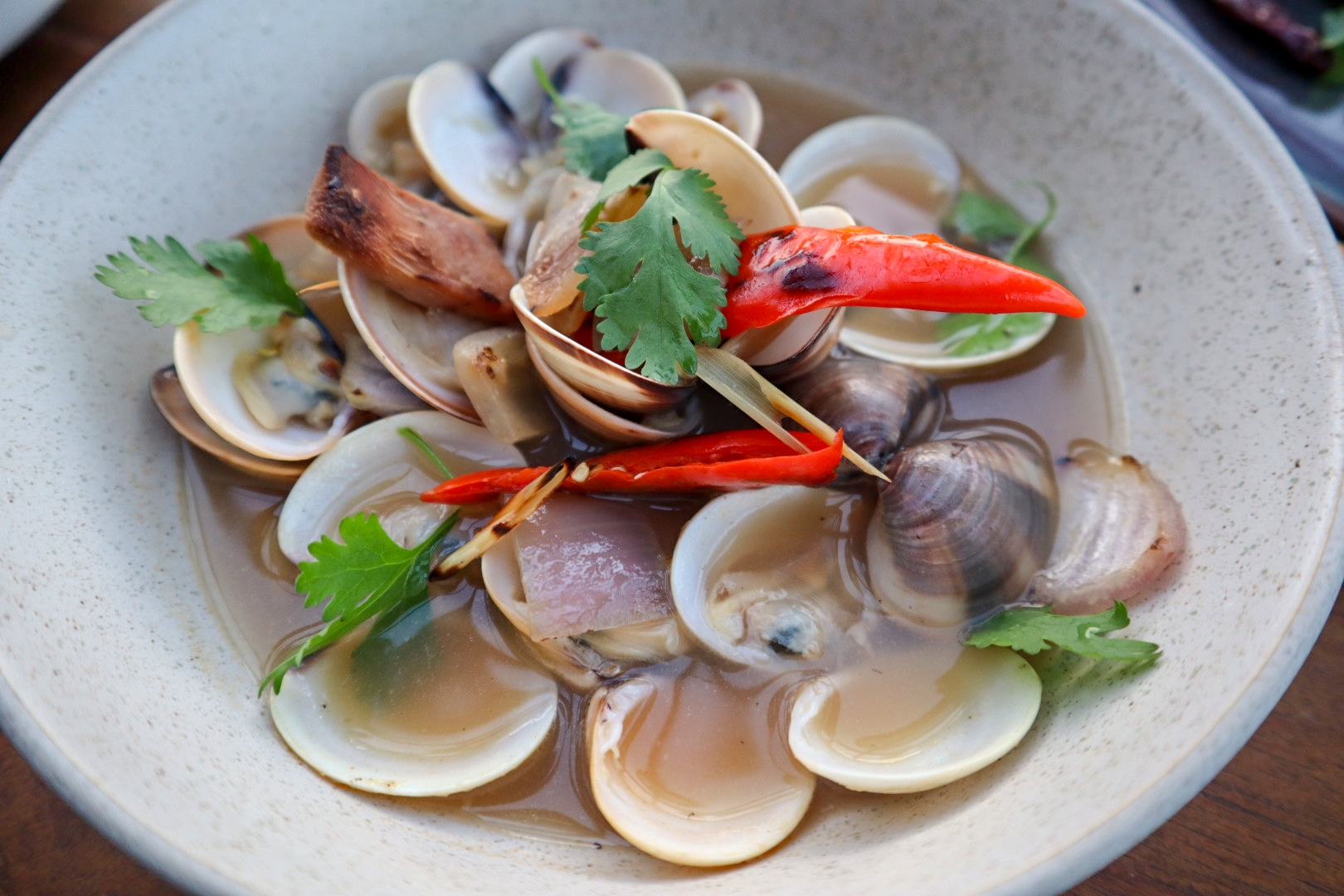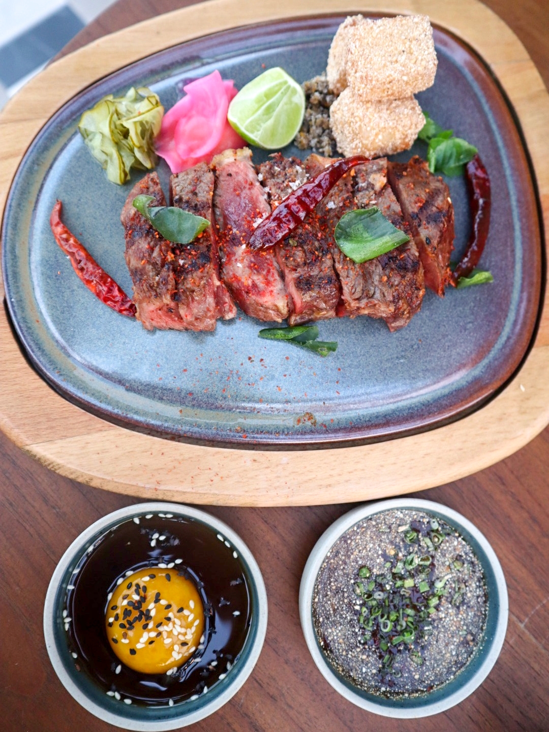 From the large plate section, meat eaters should be pleased with the mighty Grilled striploin served with jaew dip, but also contains a hidden Japanese touch in the form of togarashi (seven-flavour chilli pepper) rub and yuzu kosho. Cured egg yolk is served on the side to add creaminess to this meaty equation. For spicy and savoury slurps, check out a bowl of Steamed clams.