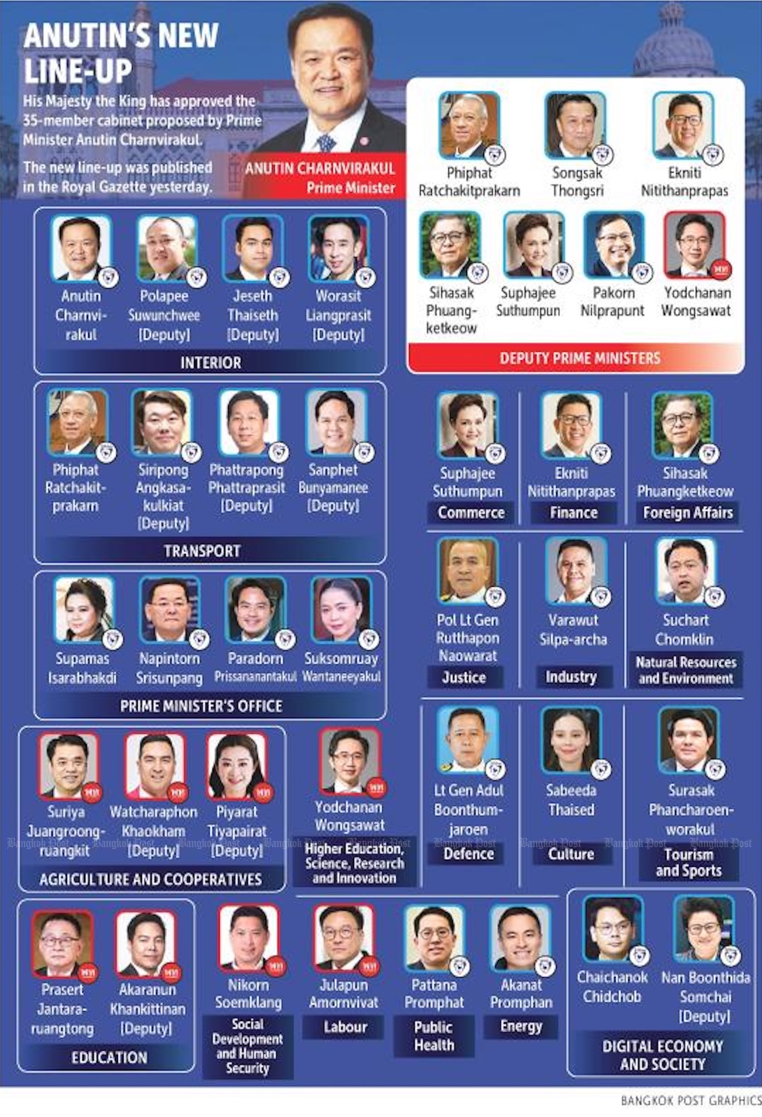 Bhumjaithai has 31 cabinet seats and Pheu Thai has nine. Thirty-five people are in the cabinet and some have concurrent positions.